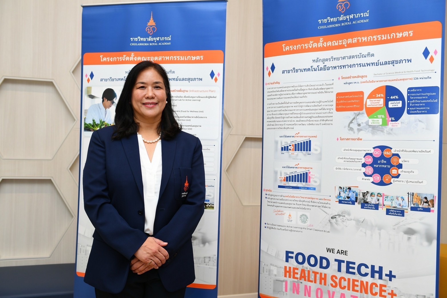 รองศาสตราจารย์ ดร.วาณี ชนเห็นชอบ หัวหน้าโครงการจัดตั้งคณะอุตสาหกรรมเกษตร แนะนำหลักสูตรวิทยาศาสตรบัณฑิต สาขาวิชาเทคโนโลยีอาหารทางการแพทย์และสุขภาพ บรรยายถึงภาพรวมของหลักสูตรฯ จากที่ปัจจุบันอาหารทางการแพทย์และสุขภาพมีแนวโน้มการเติบโตอย่างรวดเร็ว ในขณะที่ประเทศไทยยังต้องพึ่งพาต่างประเทศในด้านนี้อยู่มาก จึงจำเป็นต้องพัฒนาบุคลากรและสร้างองค์ความรู้อย่างเร่งด่วน เพื่อการพัฒนาอุตสาหกรรมอย่างยั่งยืน ให้สามารถตอบสนองความต้องการของคนไทยได้อย่างแท้จริง จึงได้ออกแบบหลักสูตรเทคโนโลยีอาหารทางการแพย์และสุขภาพ โดยได้รับการอนุมัติและเปิดรับนักศึกศึกษาในปีการศึกษา ๒๕๖๘ เป็นปีแรก เป็นหลักสูตรความร่วมมือระหว่างราชวิทยาลัยจุฬาภรณ์ ซึ่งโดดเด่นด้านวิทยาศาสตร์การแพทย์และสุขภาพ กับมหาวิทยาลัยเกษตรศาสตร์ ซึ่งโดดเด่นด้านอุตสาหกรรมเกษตรและเทคโนโลยีอาหาร เพื่อสร้างองค์ความรู้ด้านเทคโนโลยีอาหารทางการแพทย์และสุขภาพ อันจะนำไปสู่การสร้างงานวิจัยและนวัตกรรม พัฒนาผลิตภัณฑ์ และควบคุมคุณภาพอาหารทางการแพทย์และสุขภาพ ซึ่งจะช่วยพัฒนาคุณภาพชีวิตของผู้ป่วยและประชาชนทั่วไป สู่การสร้างความเข้มแข็งทางเศรษฐกิจและสังคมตามพระปณิธาน